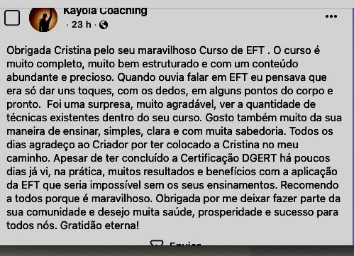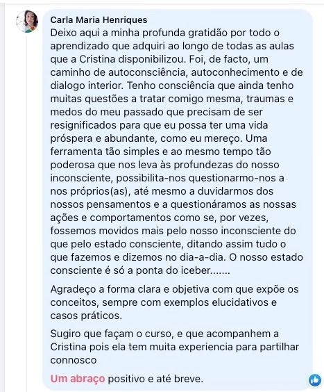 Queria agradecer à Cristina pelo excelente trabalho que tem realizado, pois é uma formadora presente, preocupada e sobretudo rápida nas repostas, pois temos sempre apoio on line durante a semana e está sempre pronta a responder por email qualquer questão. Apresentou um domínio total dos temas abordados, mais do que isso, através da sua partilha de vida, fez-nos realizar que com a EFT podemos realmente mudar a nossa vida. Estou muito grata a ela, pois é um ser maravilhoso e fez com que este curso tenha sido deveras agradável e descontraído. Para além de que alargou-me os horizontes, tanto a nível pessoal como profissional. No nível um adquiri competências essenciais sobre esta terapia e recomendo vivamente o nível dois que estou neste momento a frequentar. Superou as minhas expectativas. Obrigada Cristina Beijinhos de luz